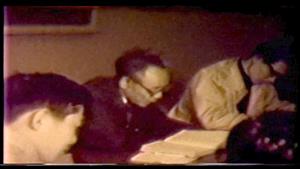 大勢先生が集まっておられます。私もどこかにいるんでしょうけども、見えませんね(杉本先生がいらっしゃいますね)当時は煙草を吸う先生方多かったですね。(煙がモクモクの感じがします)